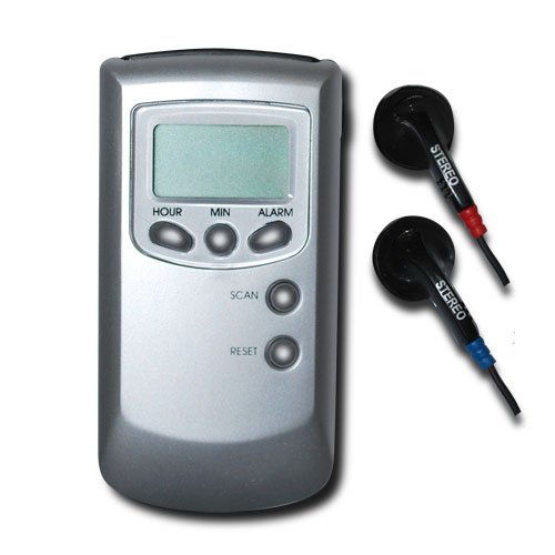Pocket size radio with alarm clock. Listen to your favorite radio broadcast anytime and anywhere.